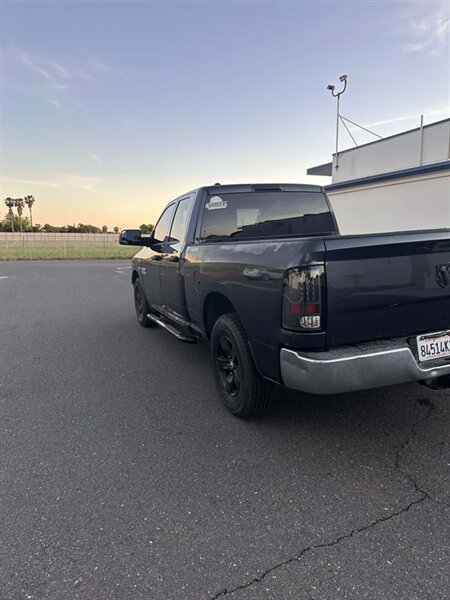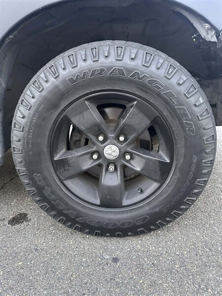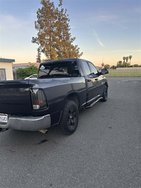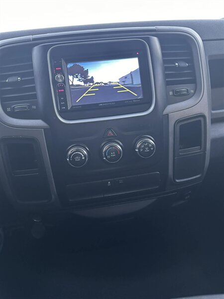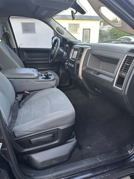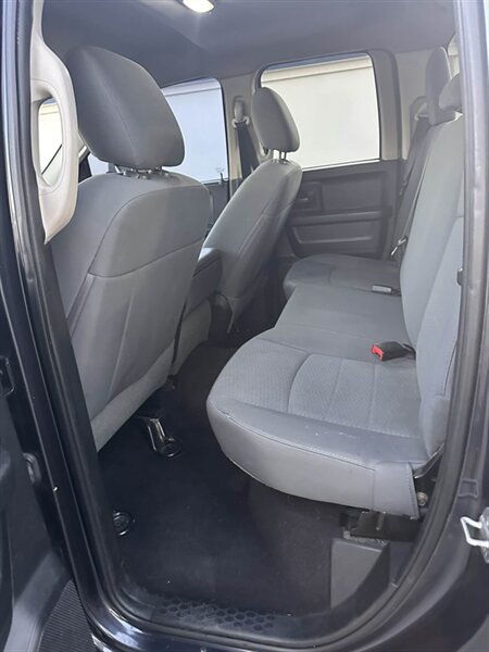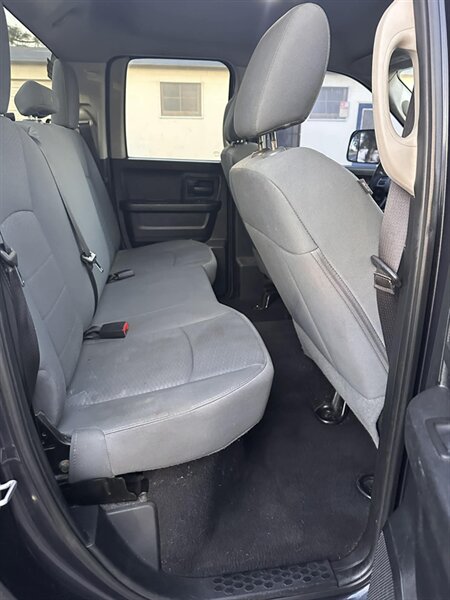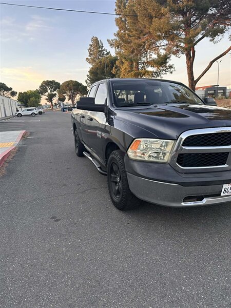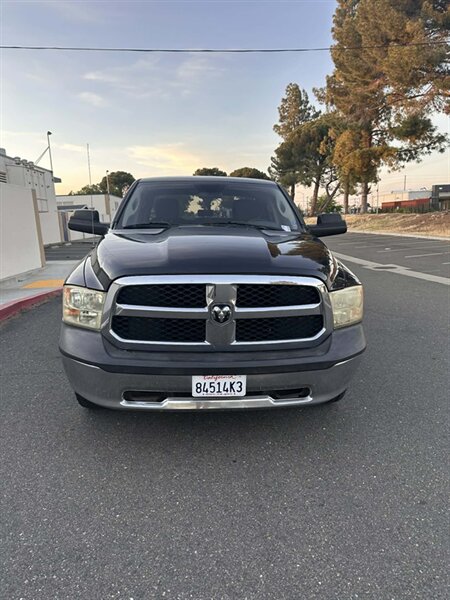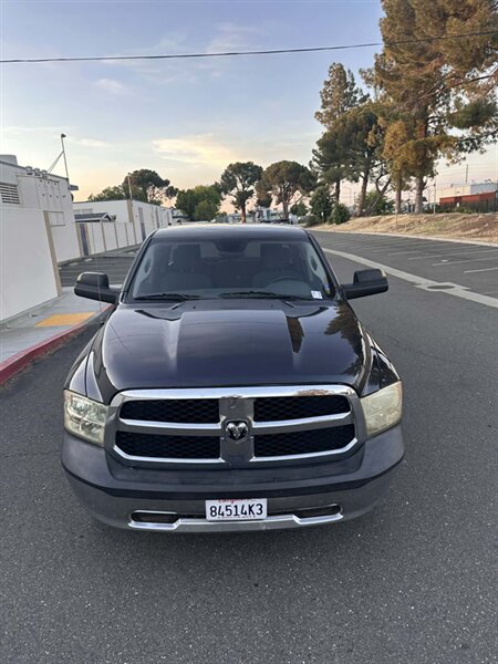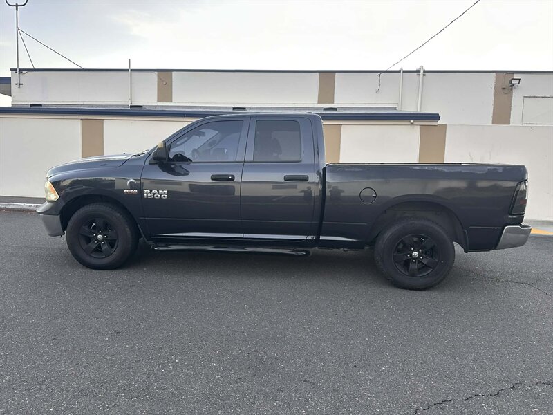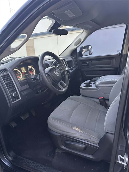 2014 RAM 1500 Tradesman in Black with a Gray interior, powered by the 5.7L HEMI V8 (395 hp, 407 lb-ft) paired with a 6-speed automatic, EPA-rated 14 MPG city / 20 MPG highway; vehicle is in excellent overall condition. Factory equipment includes the HEMI V8 powertrain with conventional towing provisions and heavy-duty cooling, 6-speed automatic transmission, durable Tradesman interior with a 40/20/40 front bench, air conditioning, tilt steering and cruise control, AM/FM audio with auxiliary input, steel wheels and full-size spare, power steering and brakes, anti-lock brakes (ABS), electronic stability control, traction control, front and side airbags, and tire pressure monitoring.