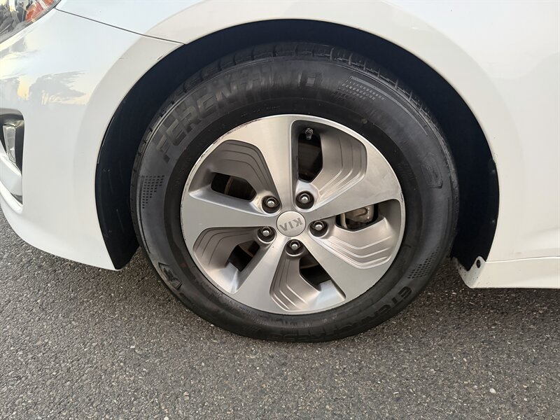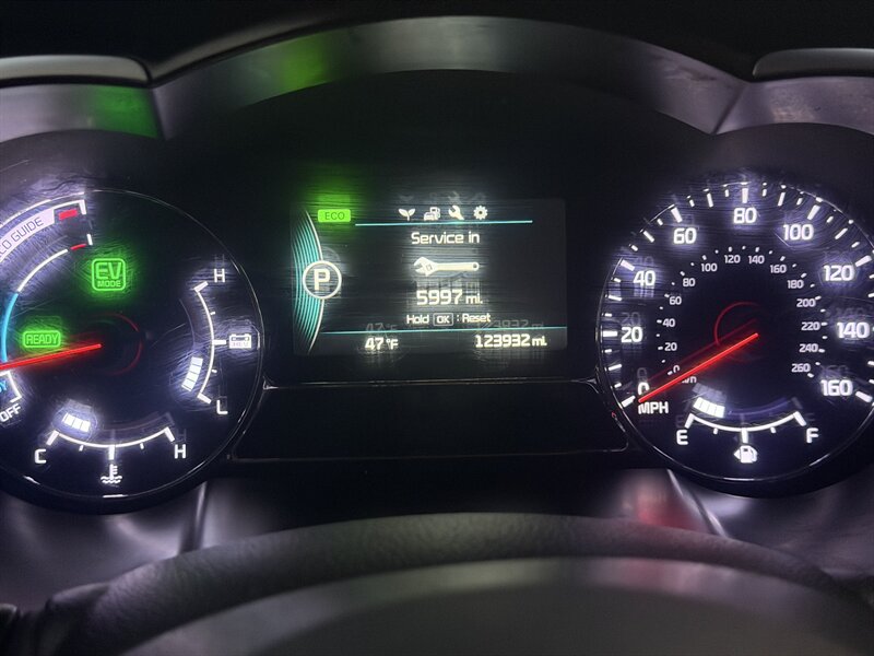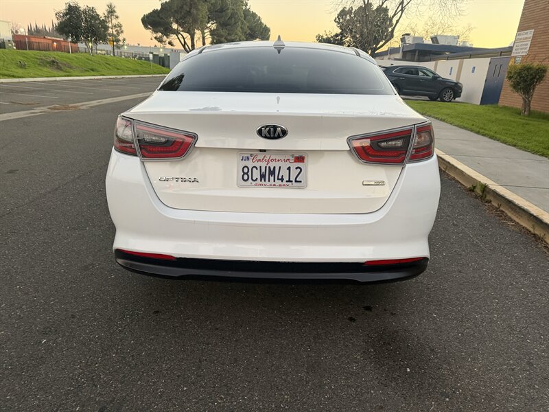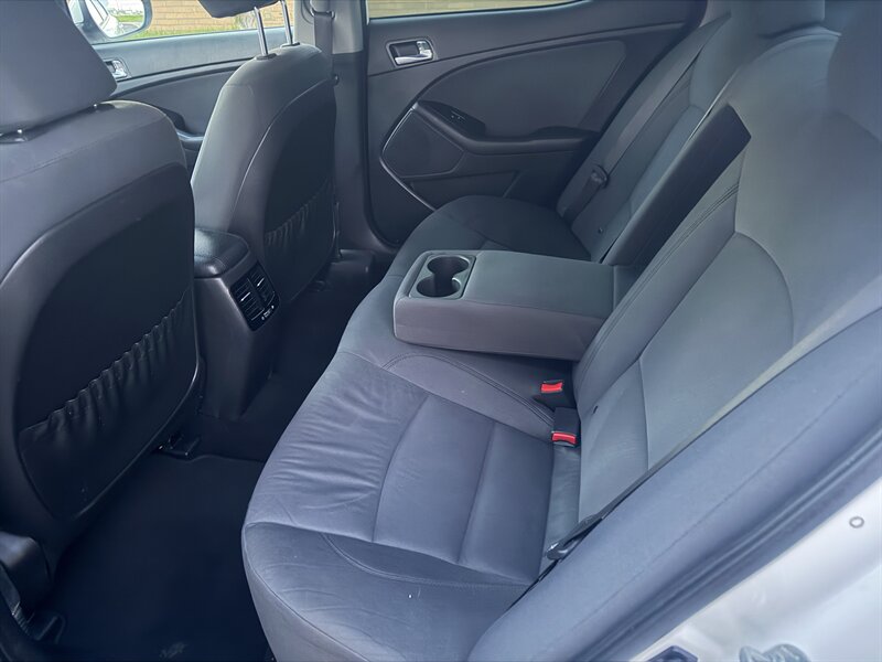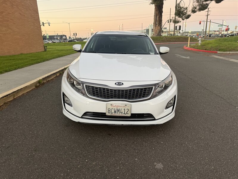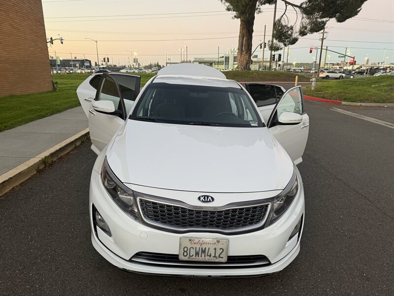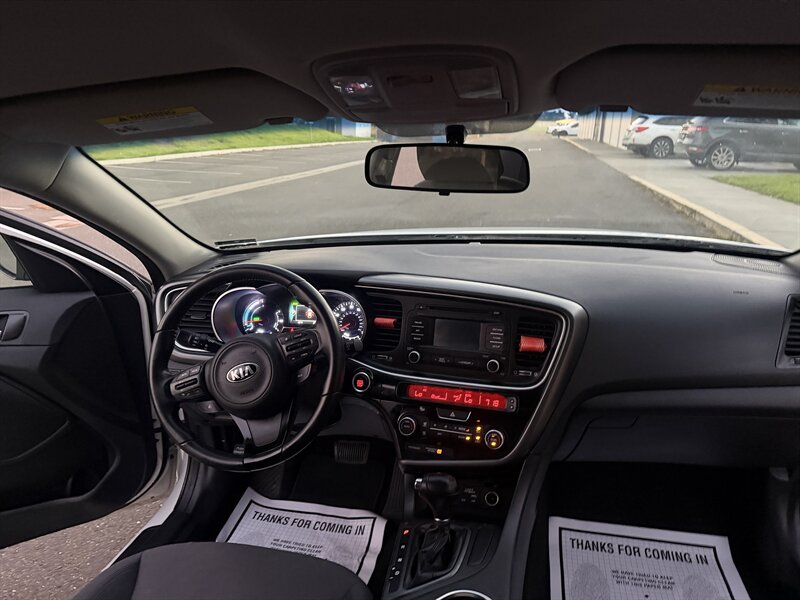 2016 Kia Optima Hybrid powered by a 2.4L Hybrid I4 producing 199 hp and 235 lb-ft, delivering an EPA-estimated 36 MPG city / 40 MPG highway. Factory-standard equipment includes the hybrid powertrain with regenerative braking, anti-lock brakes, electronic stability and traction control, multiple airbags, and tire-pressure monitoring. Comfort and convenience features include keyless entry with push-button start, automatic climate control, power windows/locks/mirrors, cruise control, steering-wheel audio and phone controls, and a factory audio system with AM/FM, Bluetooth hands-free, and USB/AUX inputs. Interior practicality is enhanced by split-folding rear seats for added cargo capacity; this vehicle is in excellent overall condition.